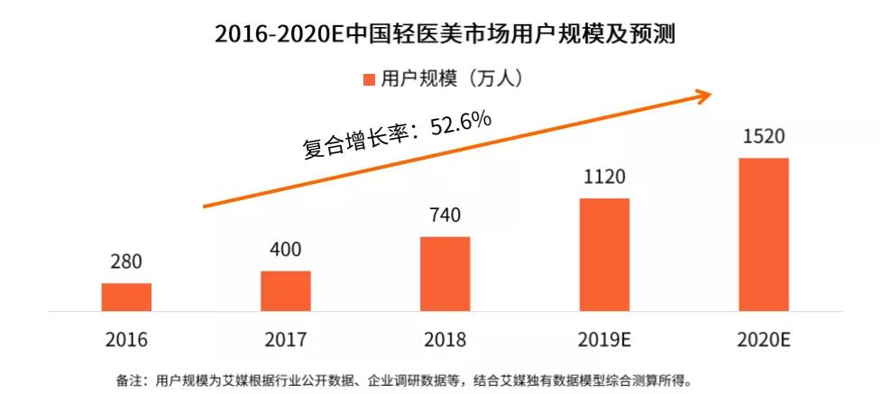 近日,艾媒咨詢《中國輕醫(yī)美消費(fèi)趨勢研究報告》最新數(shù)據(jù)顯示,2019年中國輕醫(yī)美市場用戶規(guī)模將達(dá)到1120萬人,而2016年~2020年,中國輕醫(yī)美用戶數(shù)復(fù)合增長率高達(dá)52.6%,遠(yuǎn)超醫(yī)美行業(yè)整體的增長率(中國醫(yī)美市場規(guī)模復(fù)合增長率約為40%)。可見,中國輕醫(yī)美消費(fèi)正在強(qiáng)勢崛起。