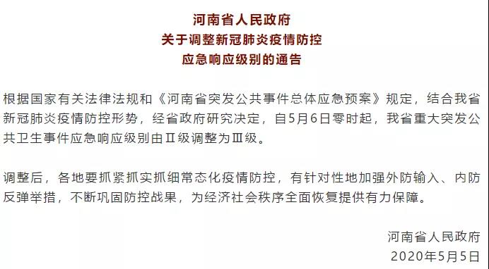 自5月6日零時起,我省重大突發(fā)公共衛(wèi)生事件應急響應級別由Ⅱ級調整為Ⅲ級。