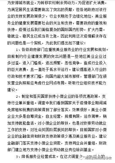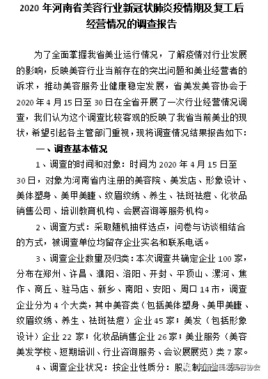河南省美發(fā)美容協(xié)會(huì)于2020年4月15日至30日在全省組織開(kāi)展了一次美容美發(fā)行業(yè)經(jīng)營(yíng)情況大型調(diào)查,現(xiàn)已將新冠狀肺炎疫情對(duì)美業(yè)的影響向有關(guān)部門報(bào)告,反映了美業(yè)企業(yè)經(jīng)營(yíng)者的訴求。